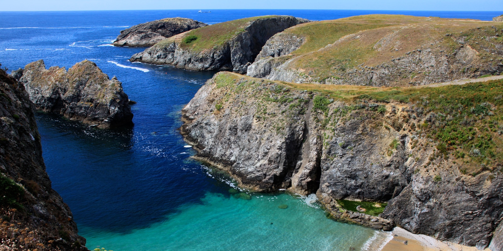 Belle-Île-en-Mer est la plus grande des îles du Morbihan et une véritable perle de l’Atlantique. Située à environ 15 km du continent, elle offre un cadre exceptionnel pour une escale en bateau avec ses paysages variés entre falaises impressionnantes, plages de sable doré et ports pittoresques. Des mouillages magnifiques : Les criques de Ster Vraz, Port-Coton et la plage des Grands Sables sont des spots parfaits pour jeter l’ancre.